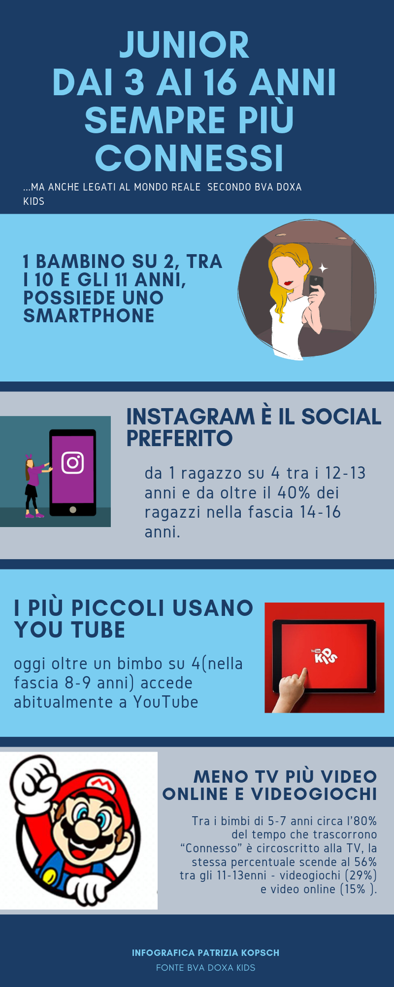 Ho riassunto i punti principali in un’ infografica, dalla quale si possono inoltre trarre informazioni anche sulle piattaforme social adottate dai ragazzi e dai più piccini che, auspichiamo, mentre muovono i primi passi nella Rete saranno seguiti da genitori attenti…